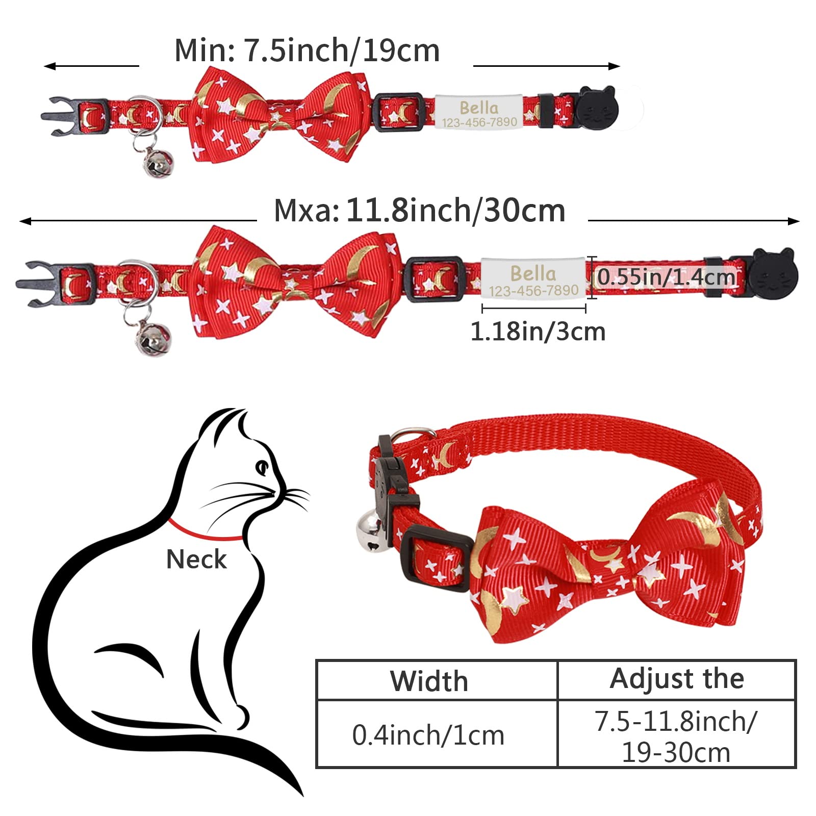 - Material & Size: The cat collar is made of polyester fabric, soft and comfortable, durable and not easy to break. The adjustable range is approximately: 7.5-11.8 inches (19-30 cm).